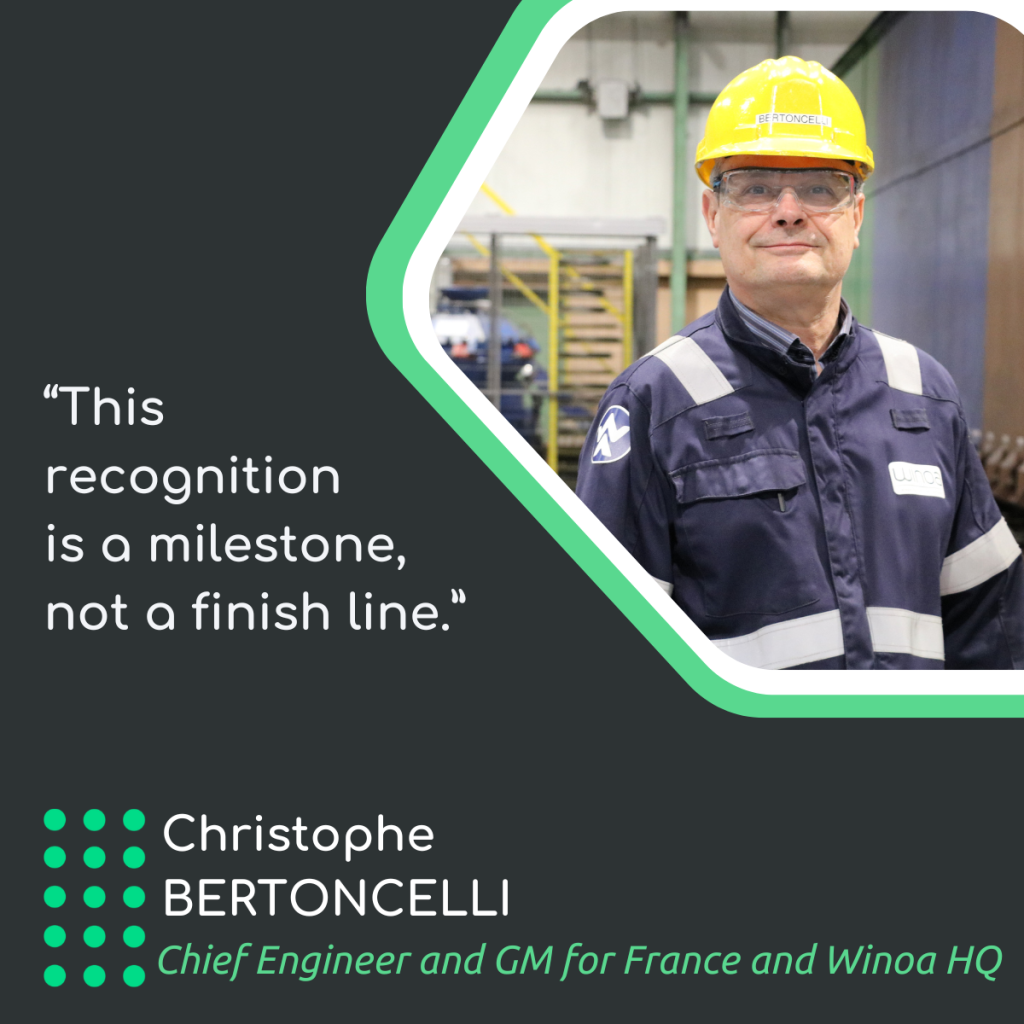 Nous sommes fiers de figurer parmi les 11 % des meilleures entreprises de notre secteur, mais ce qui compte le plus, c’est l’effort collectif qui se cache derrière cette réussite. Nos équipes à travers le monde concrétisent le développement durable grâce à l’innovation, à des pratiques éthiques et à des décisions quotidiennes qui façonnent un secteur meilleur. Cette reconnaissance est une étape importante, mais pas une ligne d’arrivée. Nous continuerons à aller de l’avant, ensemble, pour construire un avenir plus responsable et plus résilient pour la métallurgie. », Christophe Bertoncelli, ingénieur en chef et directeur général pour la France et le siège social de Winoa